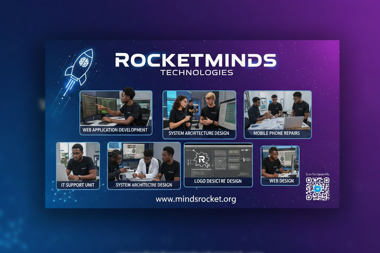 We offer professional services to businesses and individuals who are in need of IT services such as website design, web application development, logo design, flyer design, banner design, calender design and many more. At Rocketminds, our staffs are highly competent, intelligent, and professional. They are serious, responsible, and dedicated to delivering quality services to businesses and clients. Our team is also friendly and approachable, ensuring smooth communication and strong working relationships. With proven experience and expertise, Rocketminds staff consistently provide reliable, efficient, and high-standard solutions you can trust.